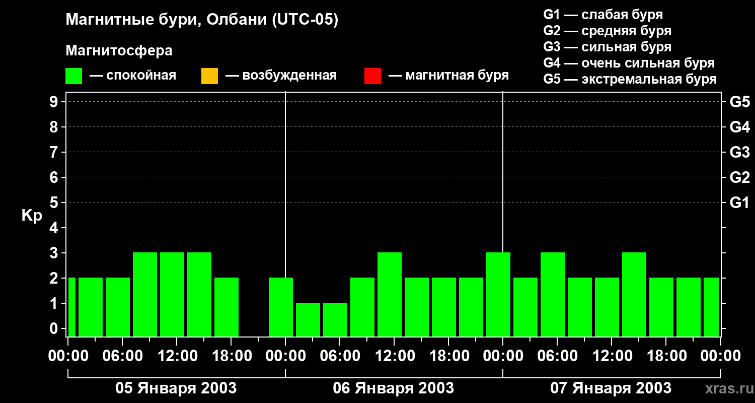 Изменения геомагнитного индекса Kp с 5 по 7 января 2003 года для средних широт