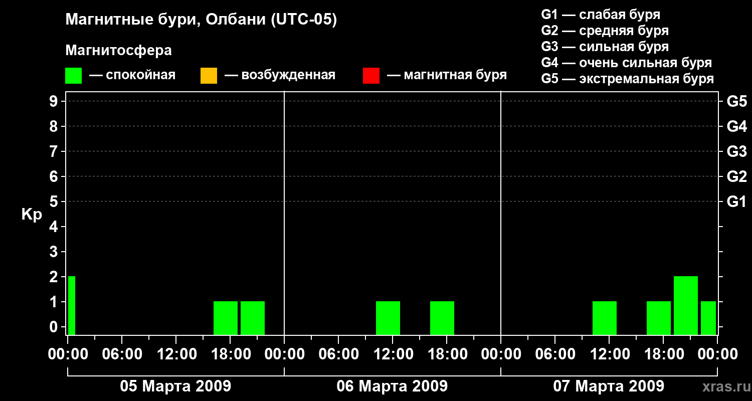 Изменения геомагнитного индекса Kp с 5 по 7 марта 2009 года для средних широт