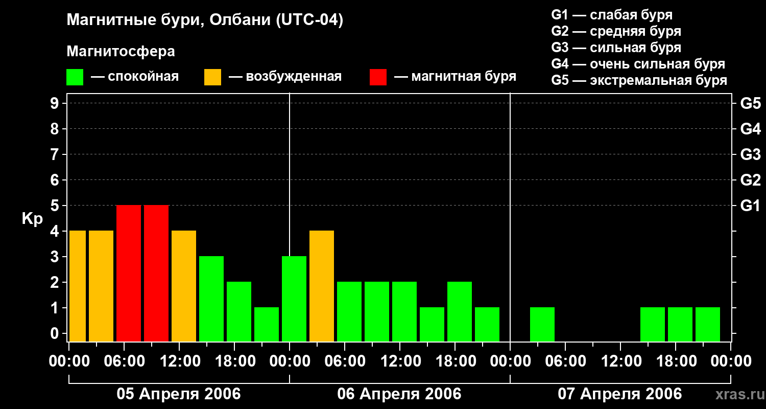 Изменения геомагнитного индекса Kp с 5 по 7 апреля 2006 года для средних широт