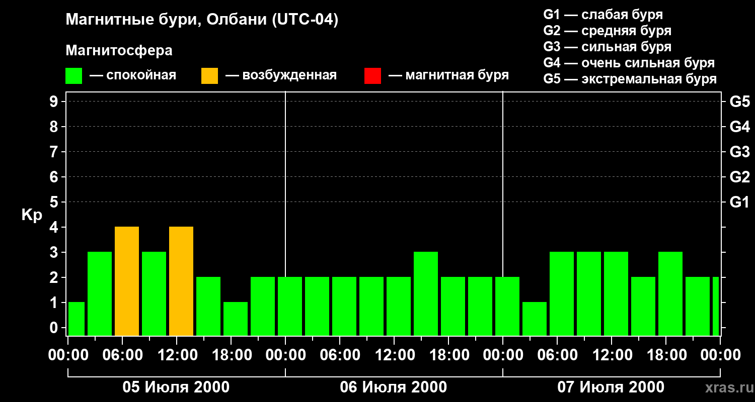 Изменения геомагнитного индекса Kp с 5 по 7 июля 2000 года для средних широт