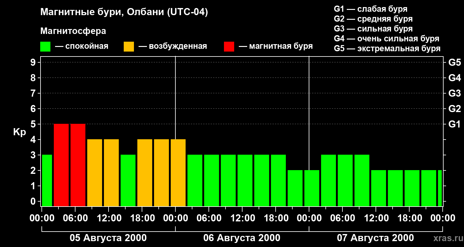 Изменения геомагнитного индекса Kp с 5 по 7 августа 2000 года для средних широт