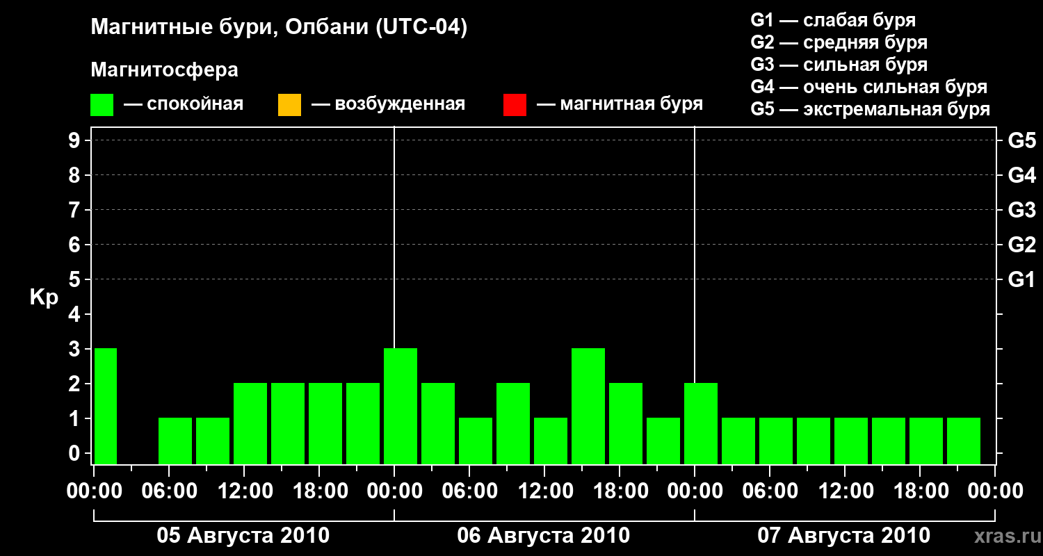 Изменения геомагнитного индекса Kp с 5 по 7 августа 2010 года для средних широт