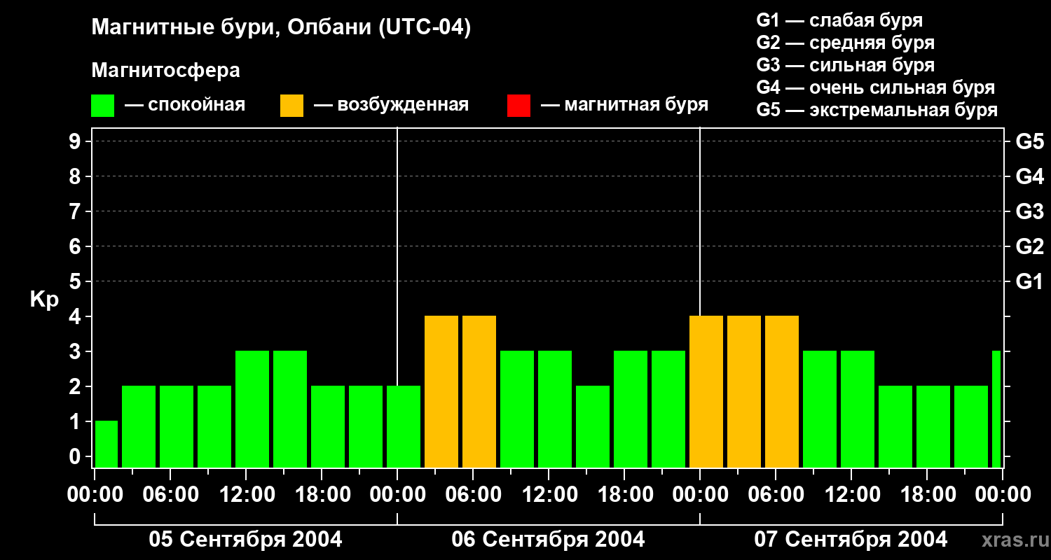 Изменения геомагнитного индекса Kp с 5 по 7 сентября 2004 года для средних широт