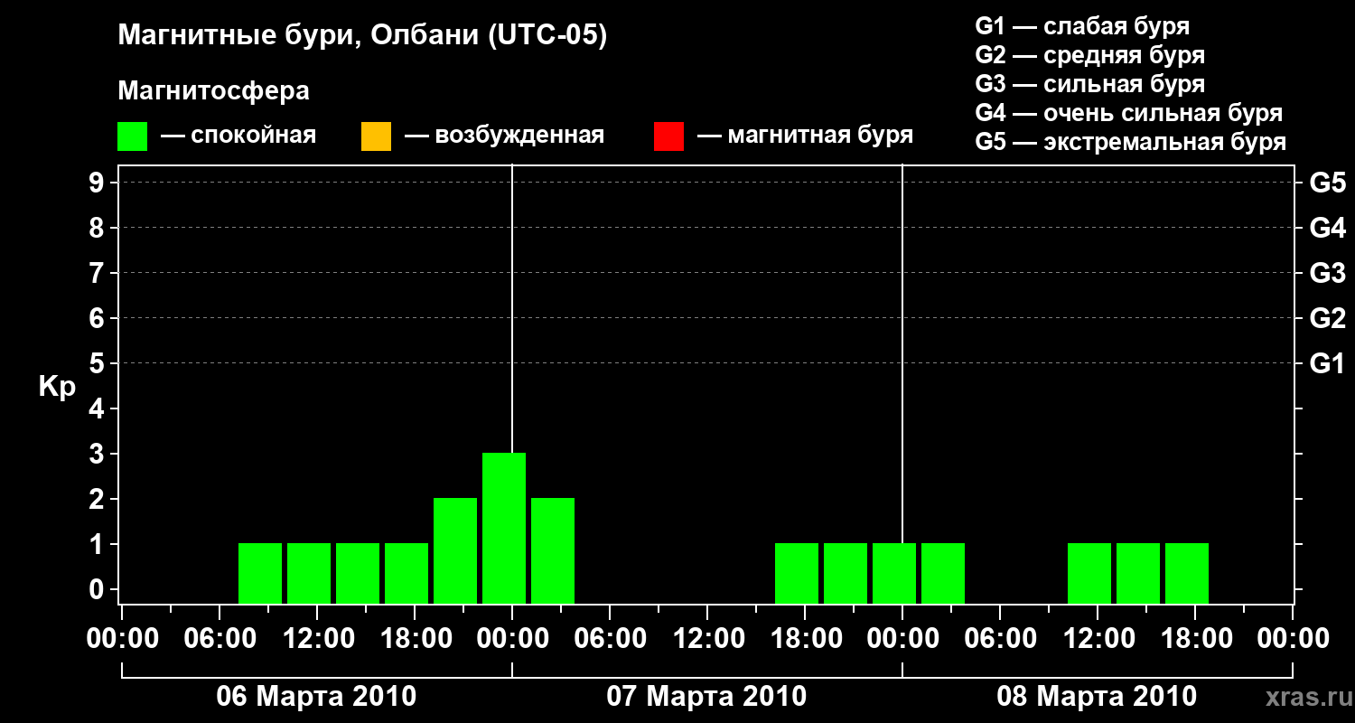 Изменения геомагнитного индекса Kp с 6 по 8 марта 2010 года для средних широт
