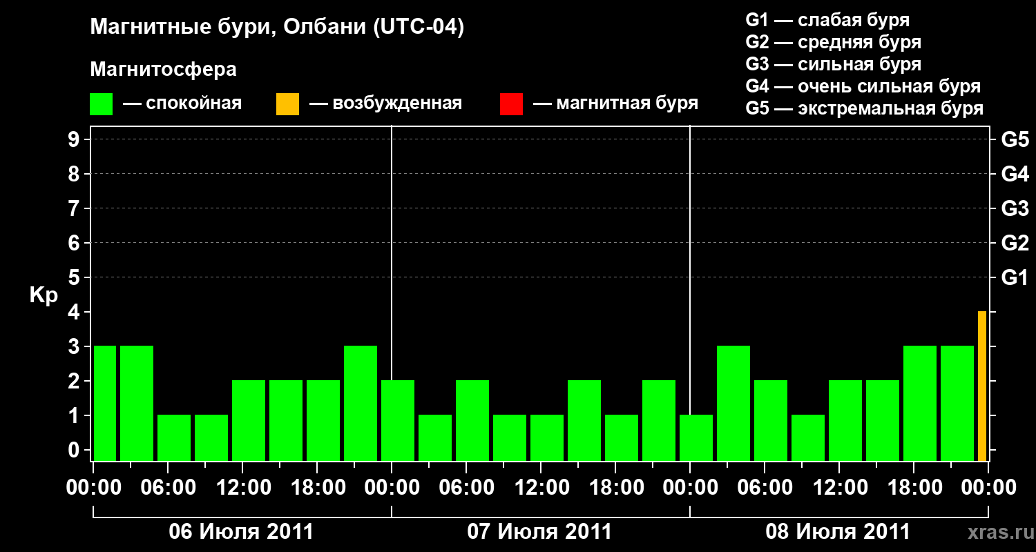 Изменения геомагнитного индекса Kp с 6 по 8 июля 2011 года для средних широт