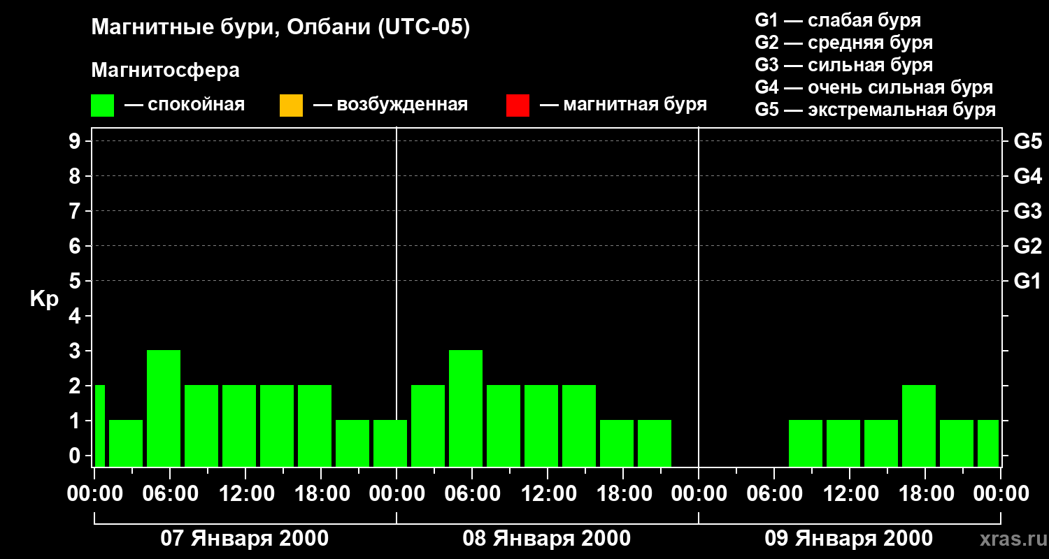 Изменения геомагнитного индекса Kp с 7 по 9 января 2000 года для средних широт