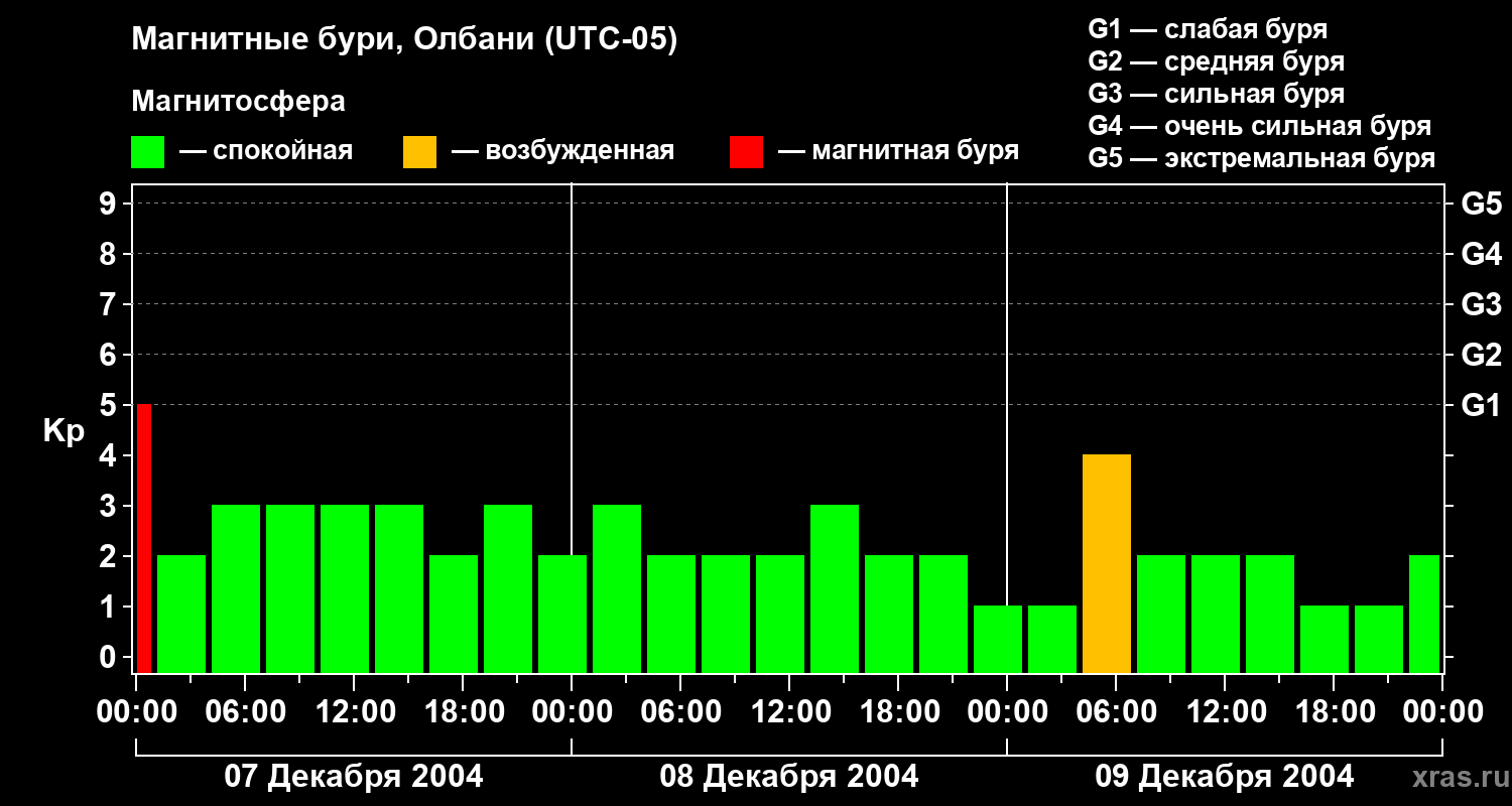 Изменения геомагнитного индекса Kp с 7 по 9 декабря 2004 года для средних широт