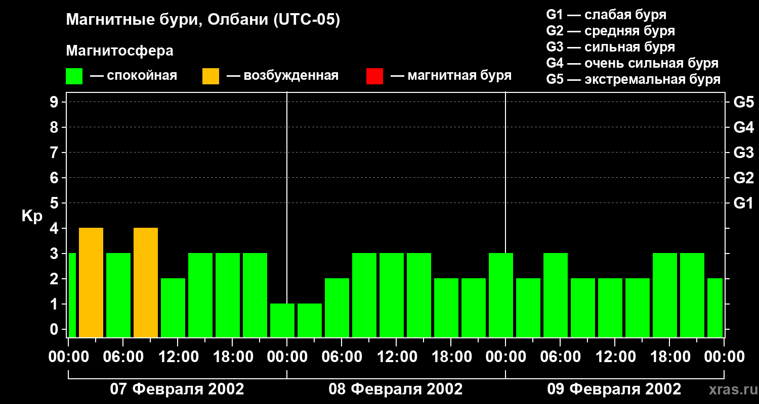 Изменения геомагнитного индекса Kp с 7 по 9 февраля 2002 года для средних широт