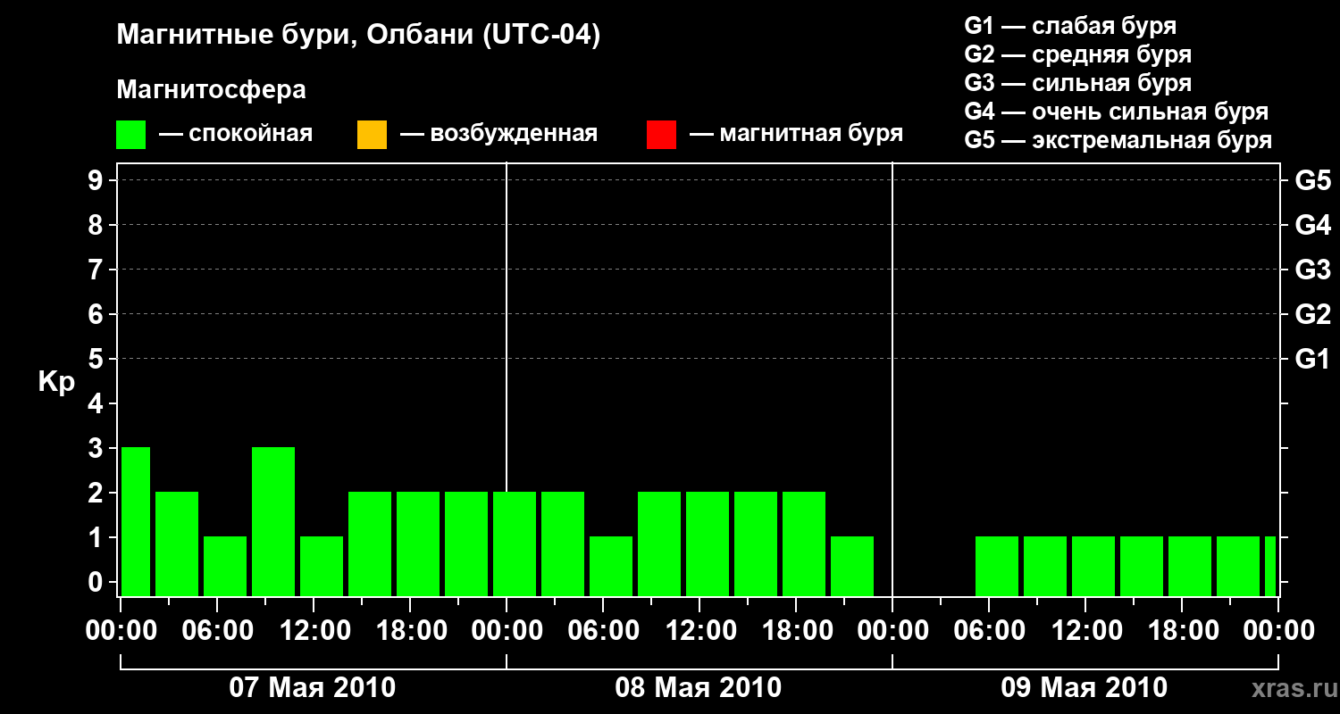 Изменения геомагнитного индекса Kp с 7 по 9 мая 2010 года для средних широт