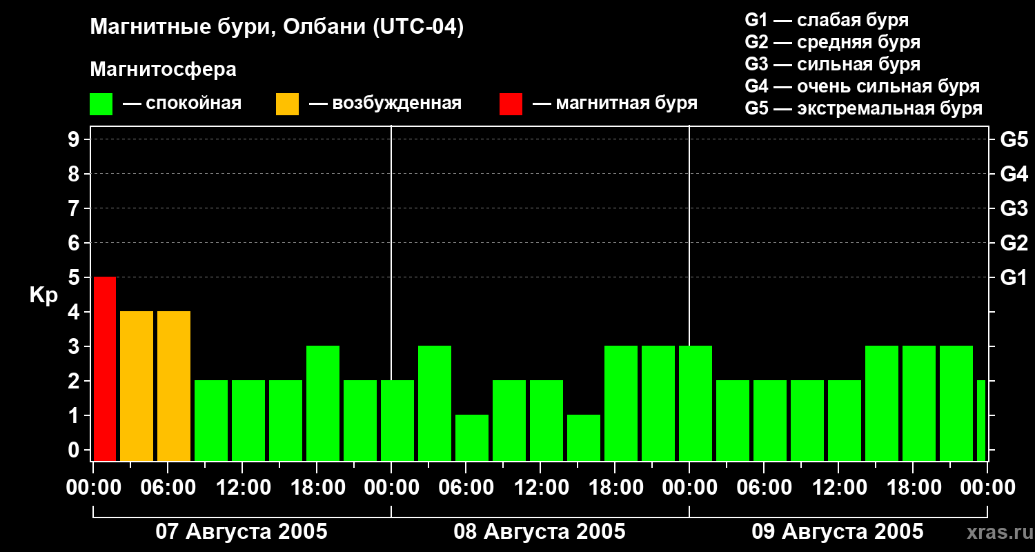 Изменения геомагнитного индекса Kp с 7 по 9 августа 2005 года для средних широт