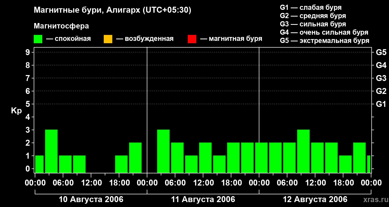 Изменения геомагнитного индекса Kp с 10 по 12 августа 2006 года для средних широт