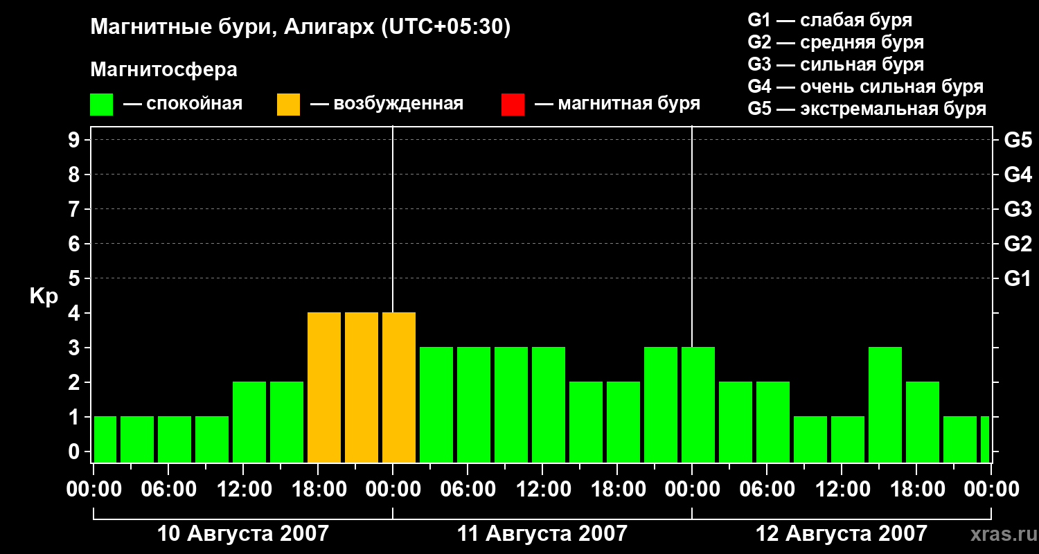 Изменения геомагнитного индекса Kp с 10 по 12 августа 2007 года для средних широт