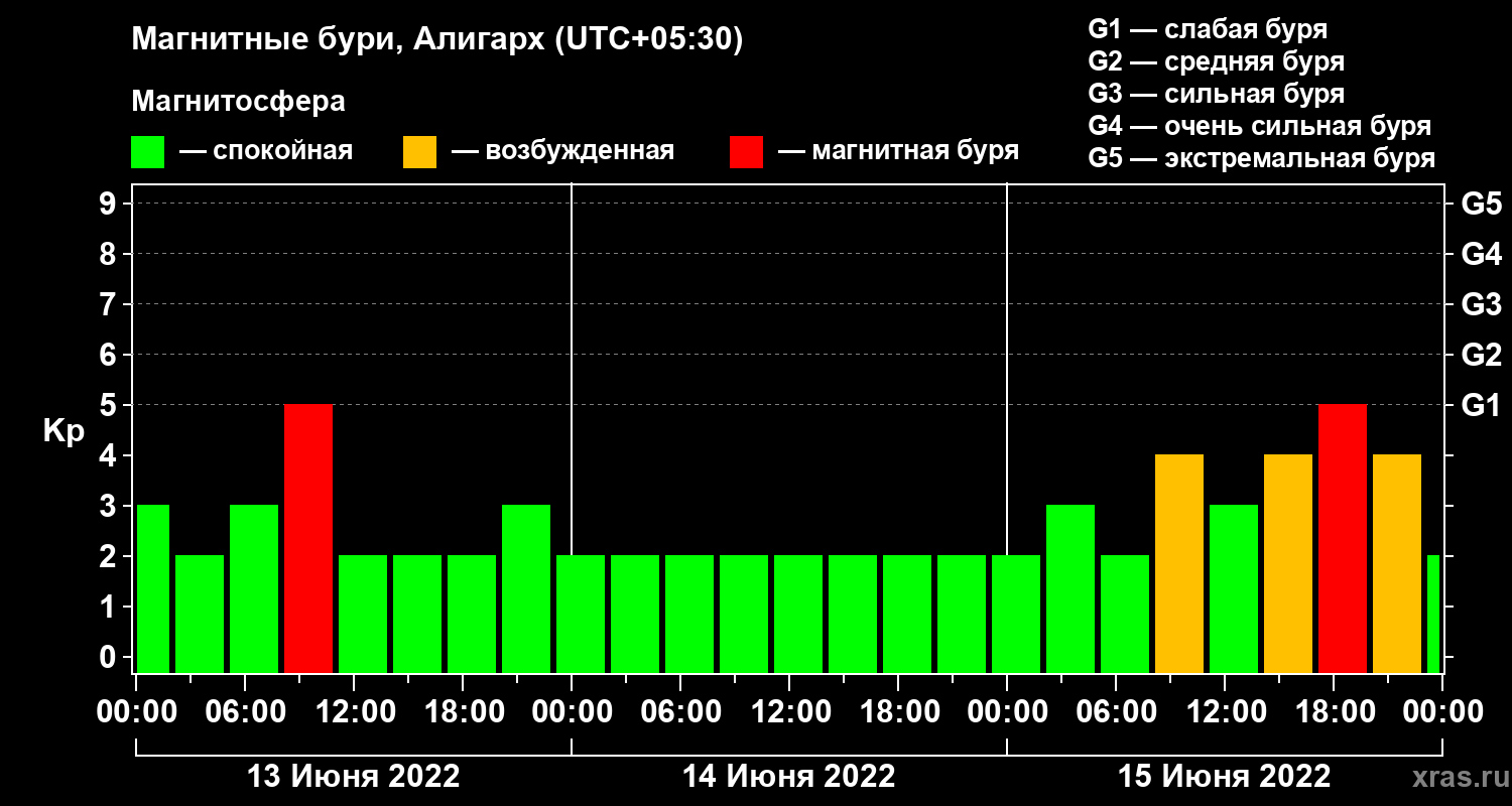 Изменения геомагнитного индекса Kp с 13 по 15 июня 2022 года для средних широт