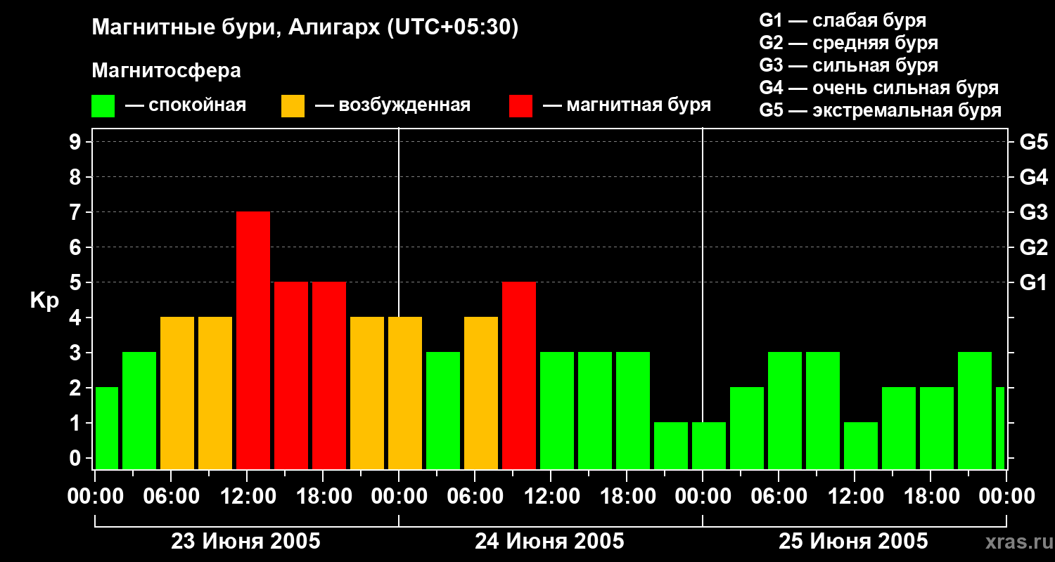 Изменения геомагнитного индекса Kp с 23 по 25 июня 2005 года для средних широт