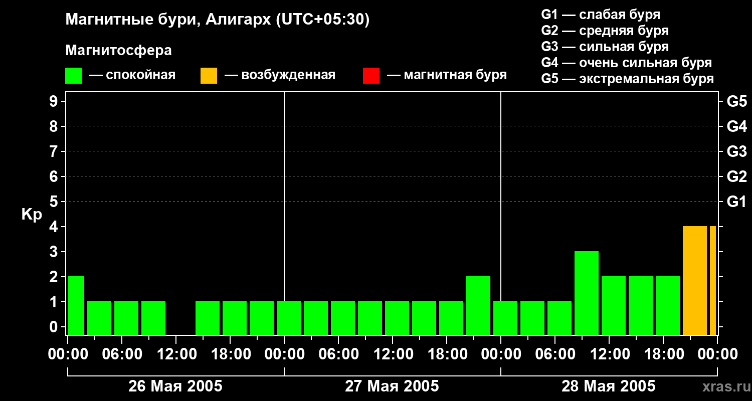 Изменения геомагнитного индекса Kp с 26 по 28 мая 2005 года для средних широт