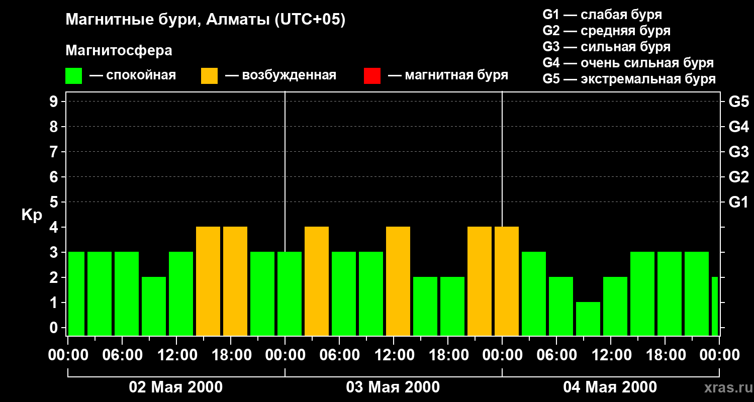 Изменения геомагнитного индекса Kp с 2 по 4 мая 2000 года для средних широт