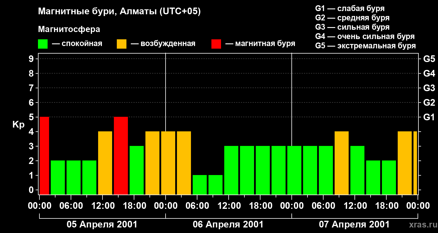 Изменения геомагнитного индекса Kp с 5 по 7 апреля 2001 года для средних широт