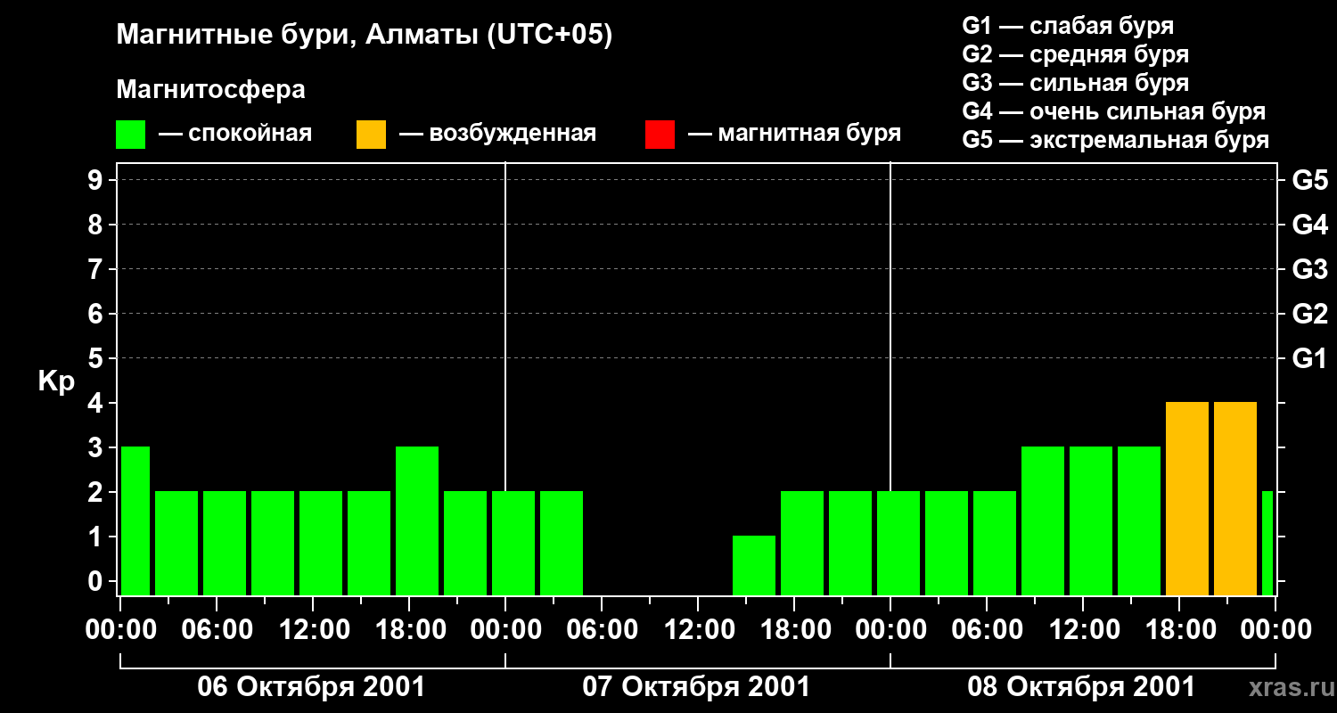Изменения геомагнитного индекса Kp с 6 по 8 октября 2001 года для средних широт