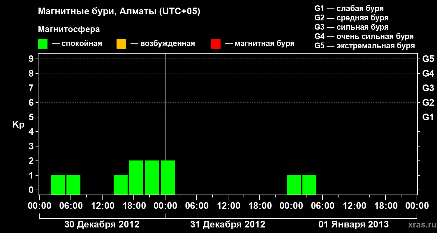 Изменения геомагнитного индекса Kp с 30 декабря 2012 года по 1 января 2013 года для средних широт