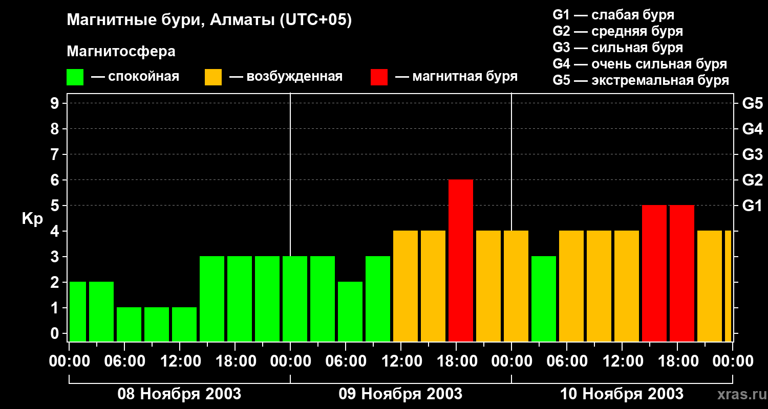 Изменения геомагнитного индекса Kp с 8 по 10 ноября 2003 года для средних широт