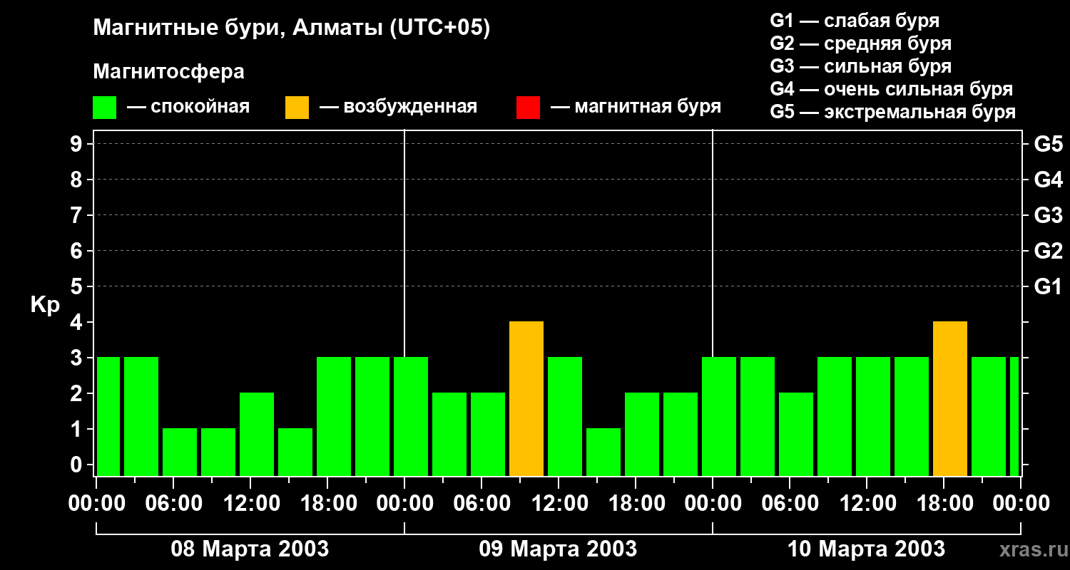 Изменения геомагнитного индекса Kp с 8 по 10 марта 2003 года для средних широт