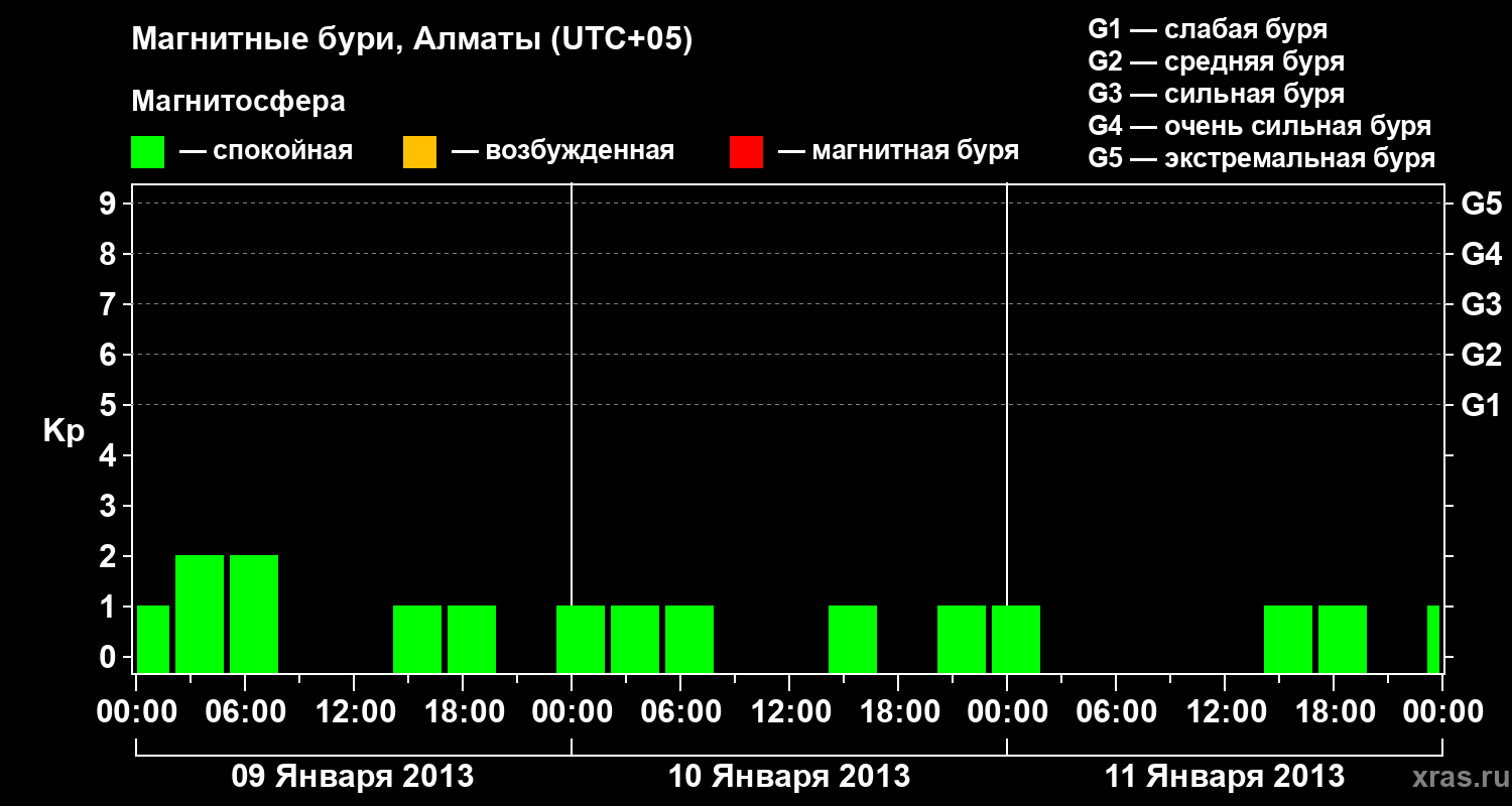 Изменения геомагнитного индекса Kp с 9 по 11 января 2013 года для средних широт