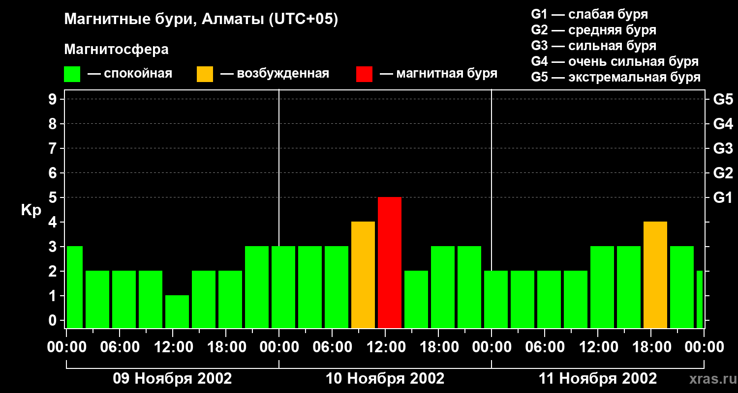 Изменения геомагнитного индекса Kp с 9 по 11 ноября 2002 года для средних широт