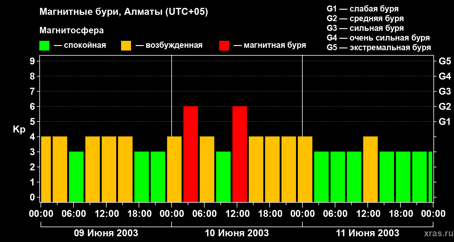 Изменения геомагнитного индекса Kp с 9 по 11 июня 2003 года для средних широт