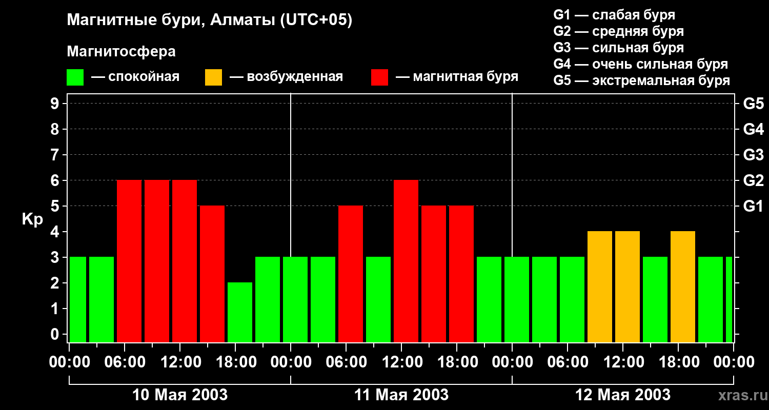 Изменения геомагнитного индекса Kp с 10 по 12 мая 2003 года для средних широт