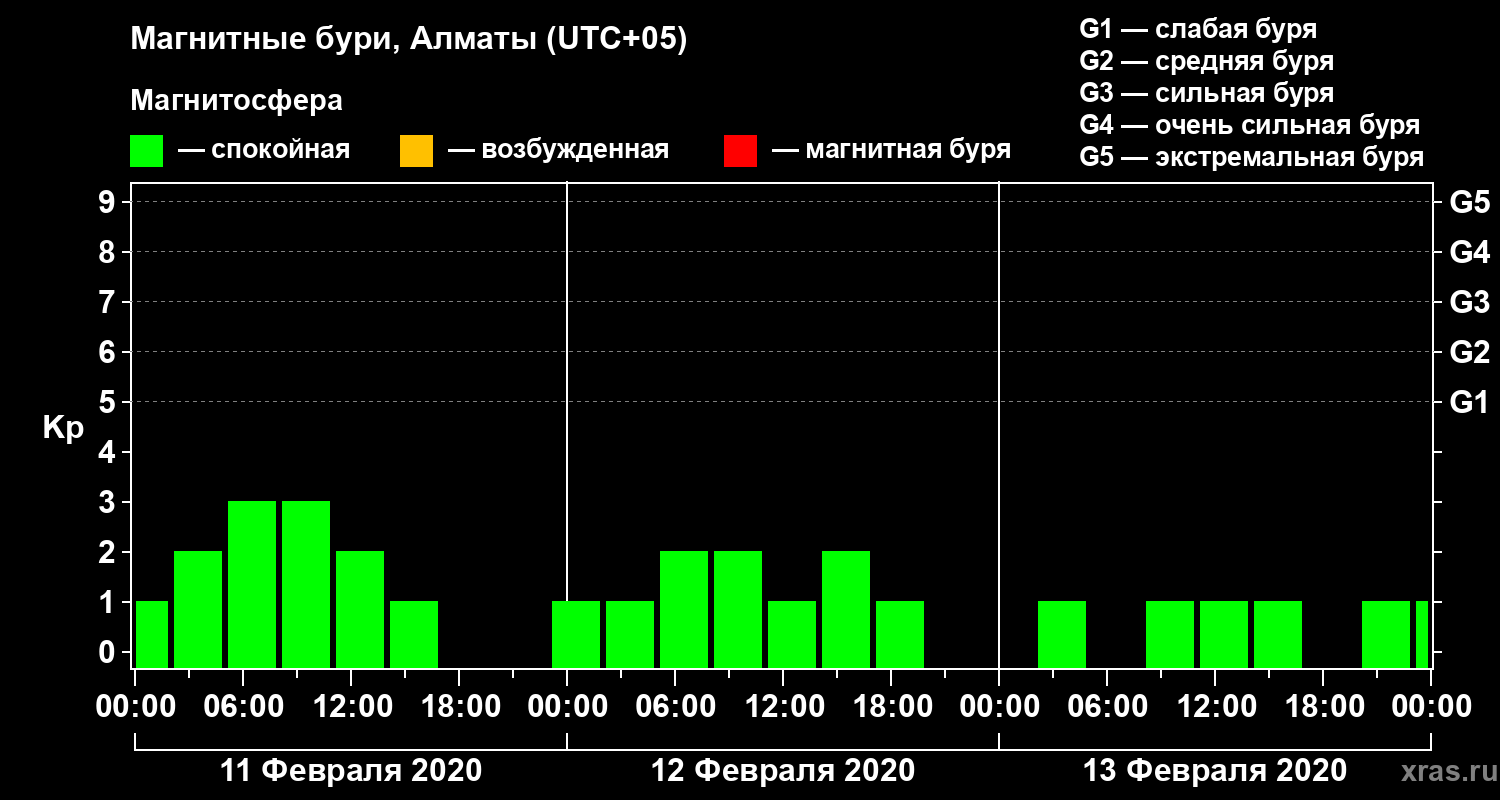 Изменения геомагнитного индекса Kp с 11 по 13 февраля 2020 года для средних широт