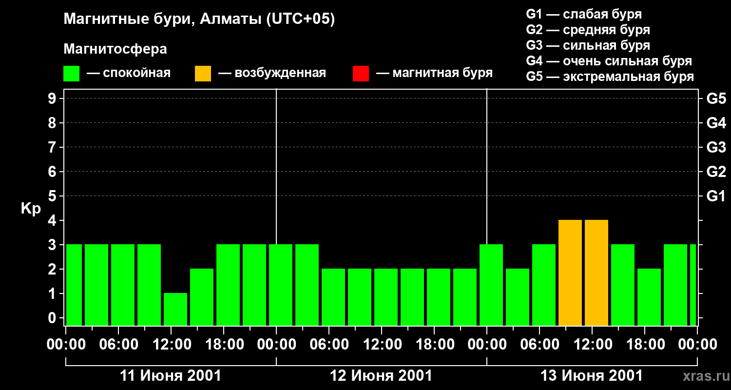 Изменения геомагнитного индекса Kp с 11 по 13 июня 2001 года для средних широт