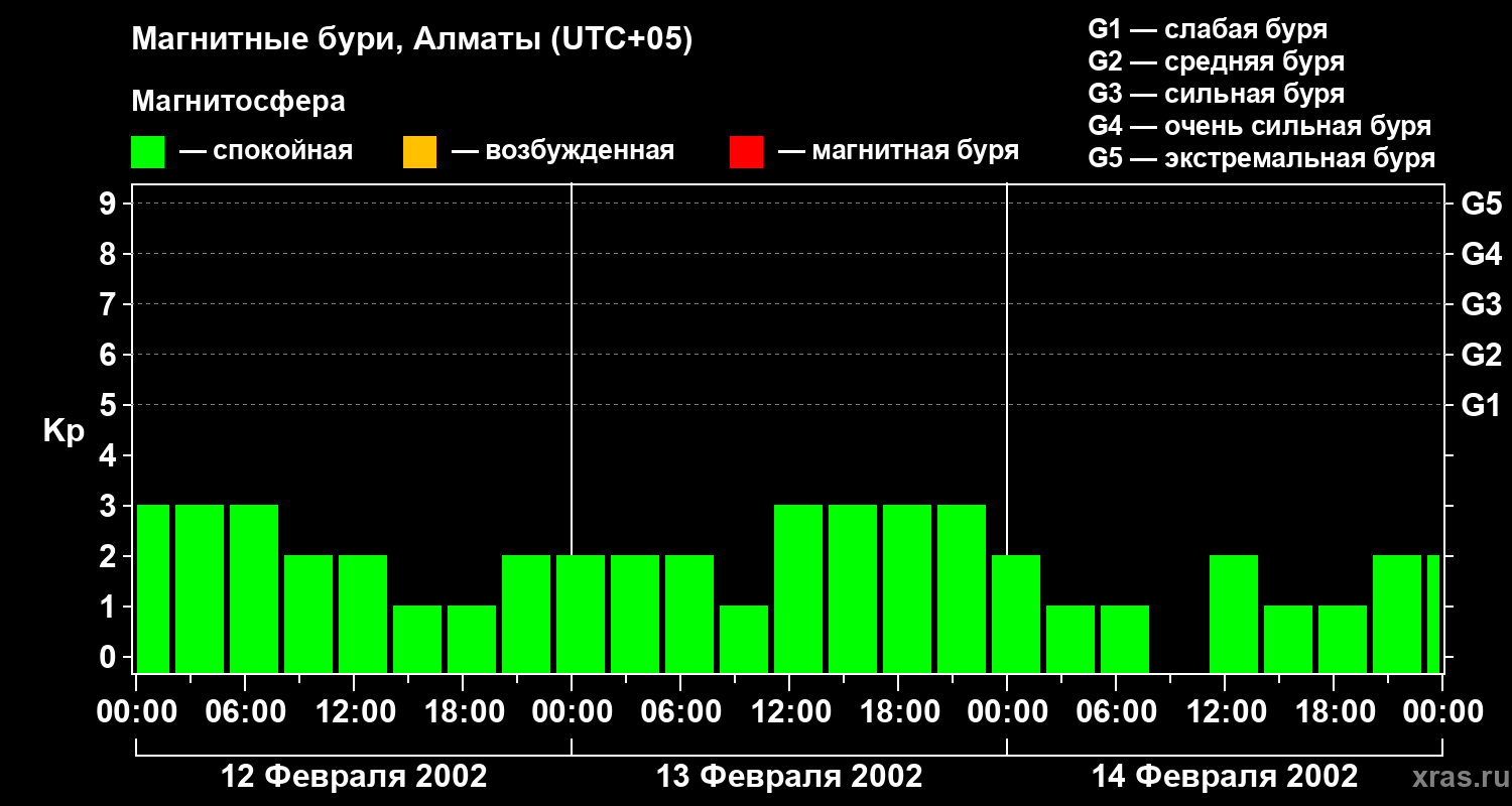 Изменения геомагнитного индекса Kp с 12 по 14 февраля 2002 года для средних широт