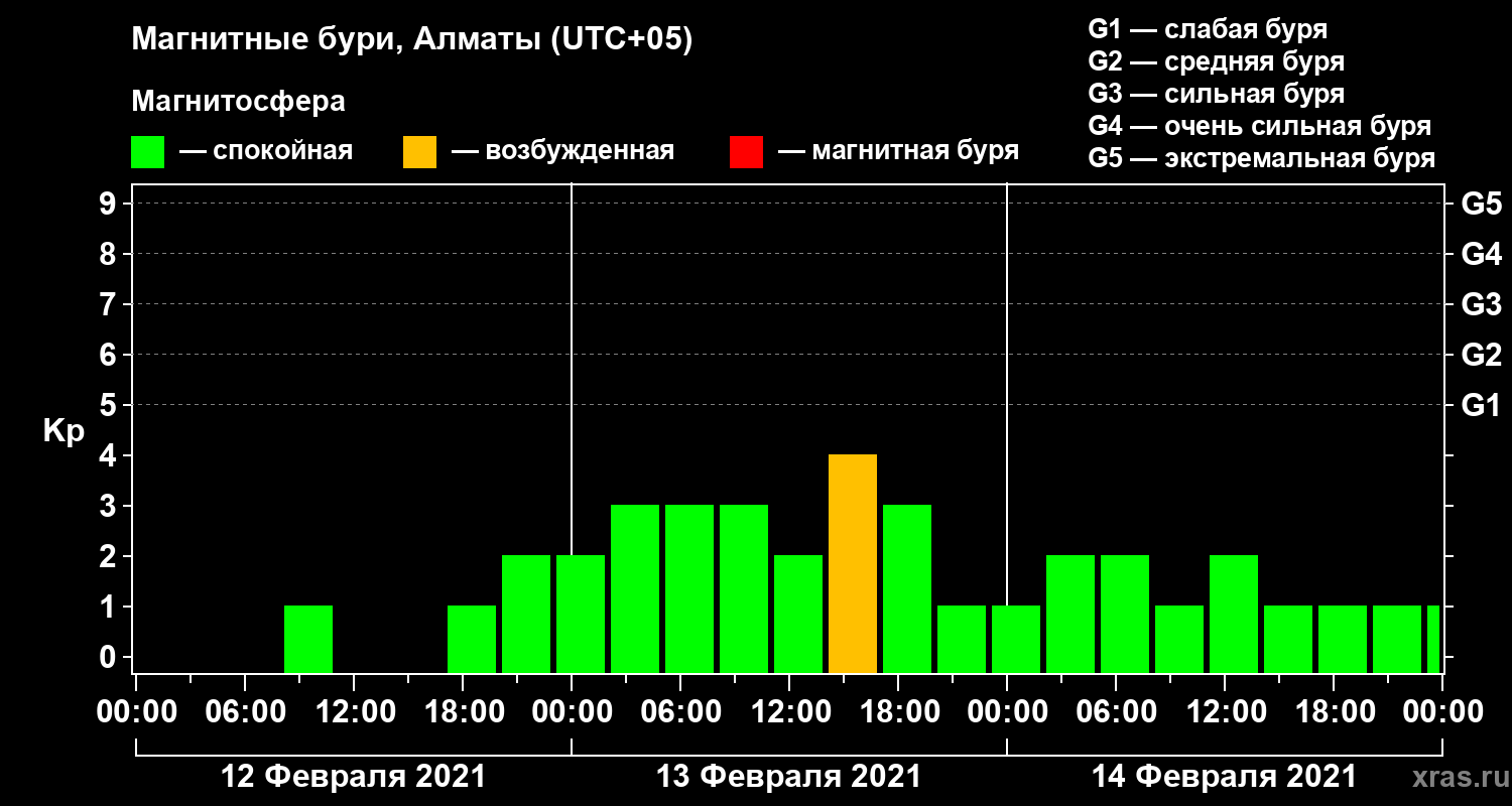 Изменения геомагнитного индекса Kp с 12 по 14 февраля 2021 года для средних широт
