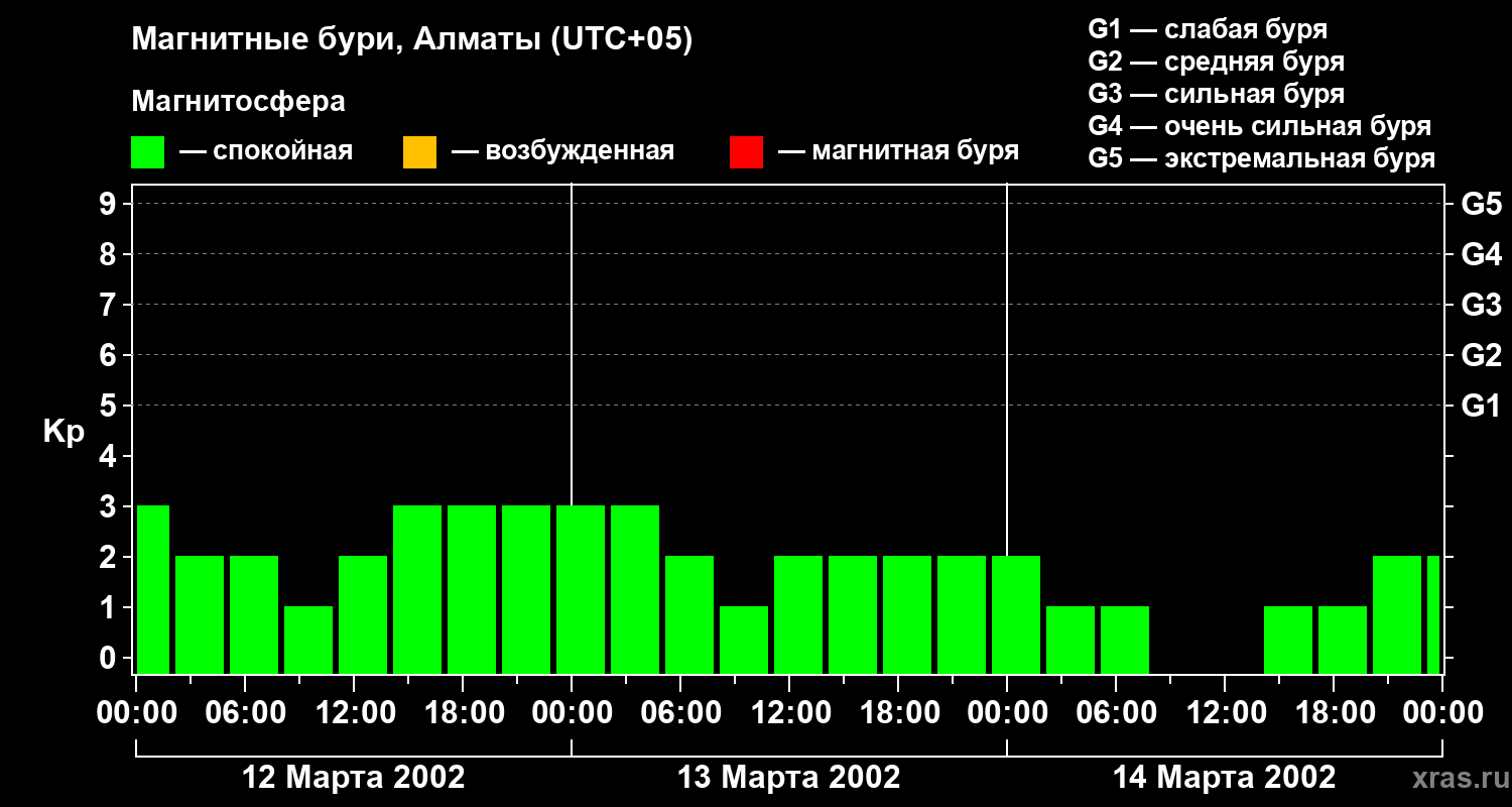 Изменения геомагнитного индекса Kp с 12 по 14 марта 2002 года для средних широт