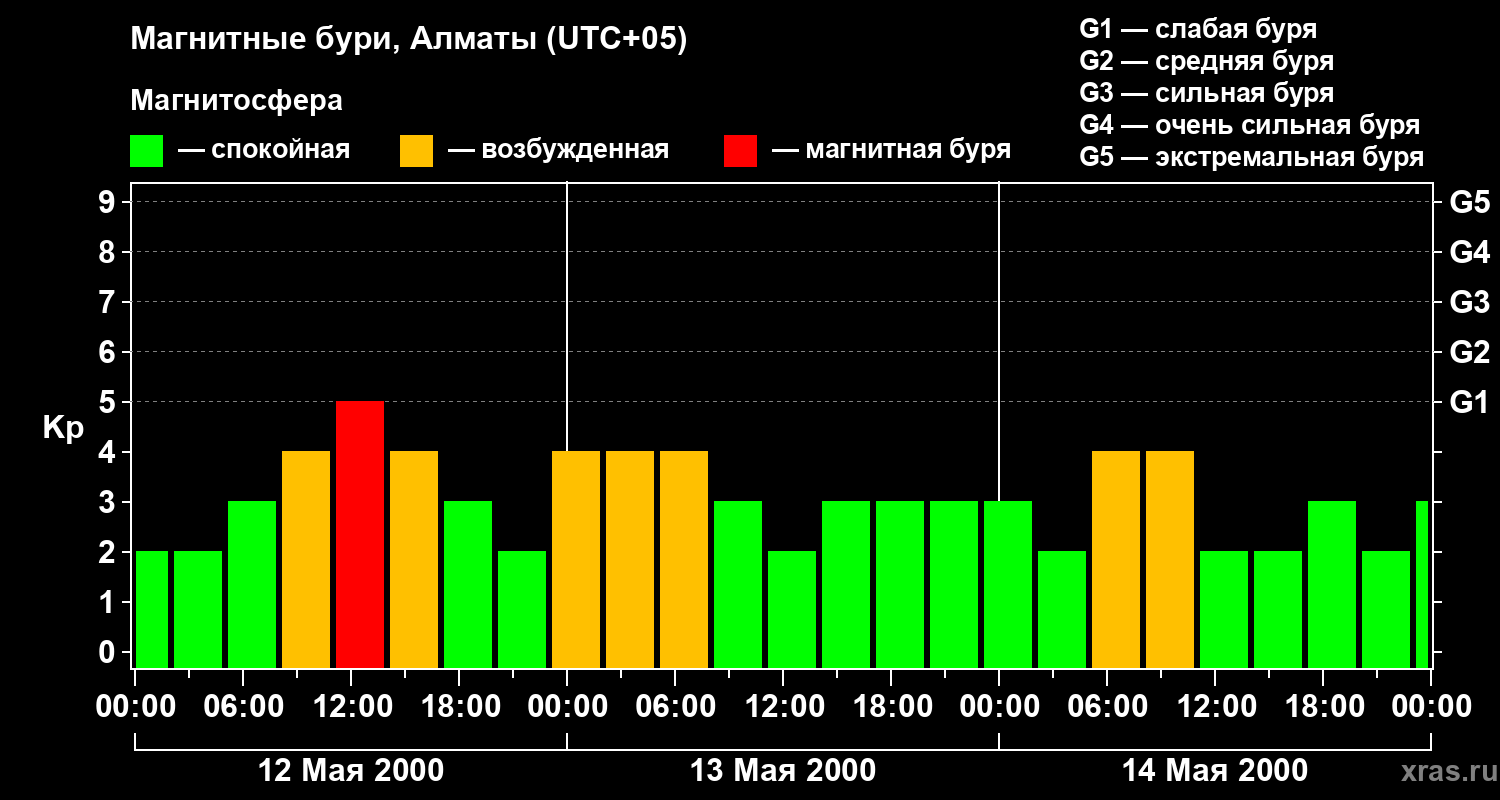 Изменения геомагнитного индекса Kp с 12 по 14 мая 2000 года для средних широт