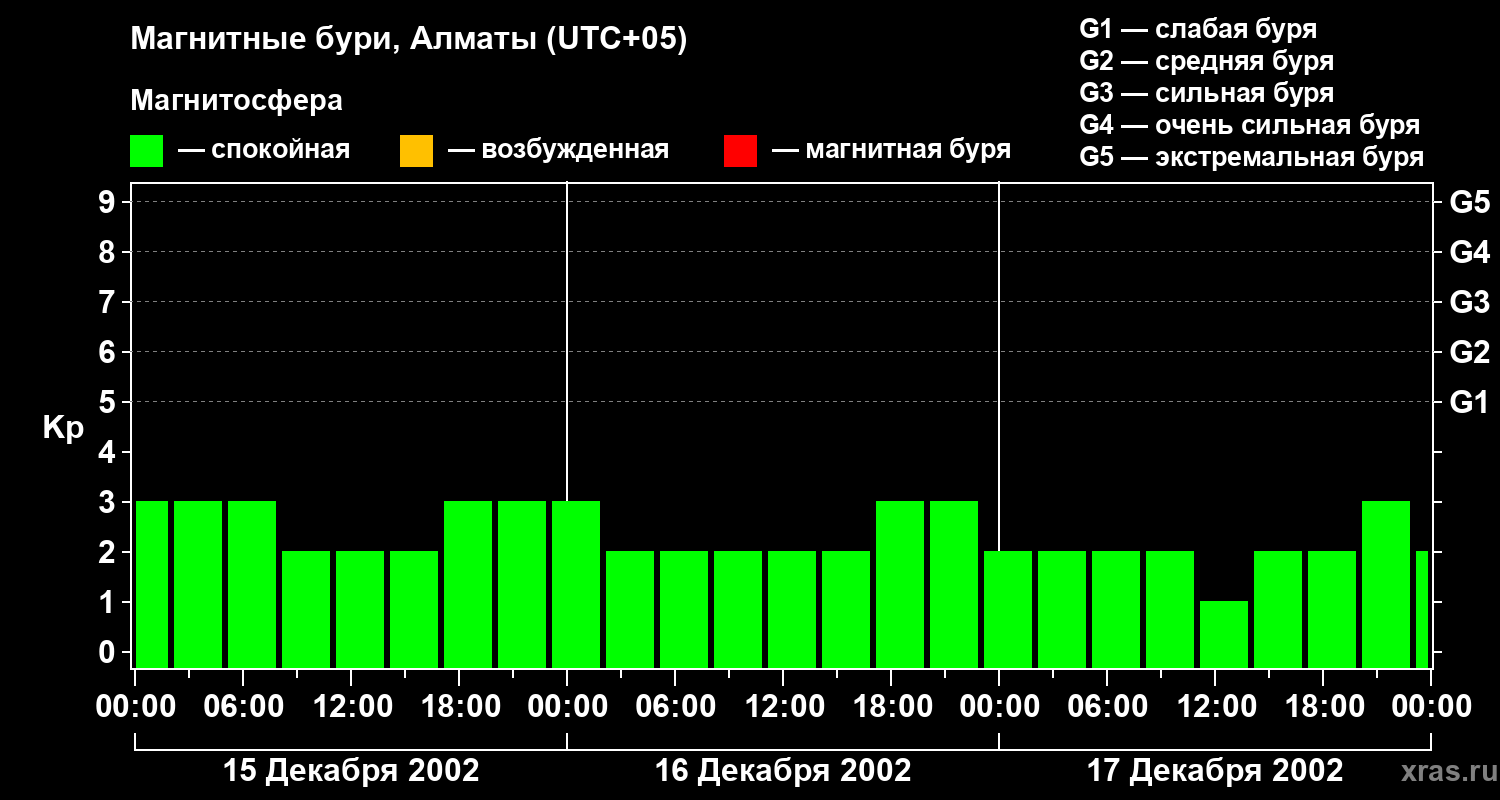 Изменения геомагнитного индекса Kp с 15 по 17 декабря 2002 года для средних широт