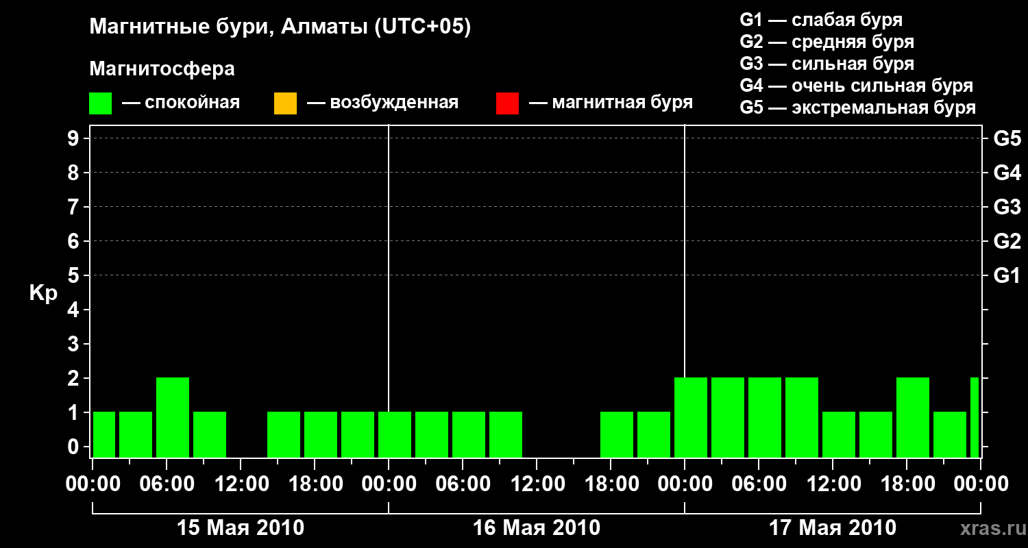 Изменения геомагнитного индекса Kp с 15 по 17 мая 2010 года для средних широт