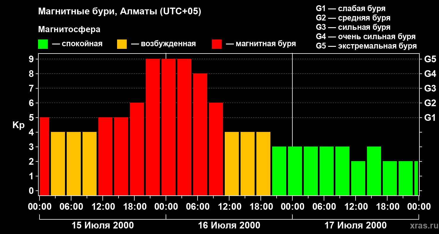 Изменения геомагнитного индекса Kp с 15 по 17 июля 2000 года для средних широт