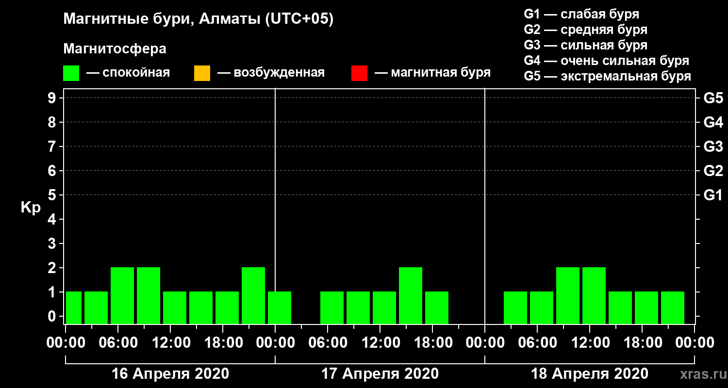 Изменения геомагнитного индекса Kp с 16 по 18 апреля 2020 года для средних широт