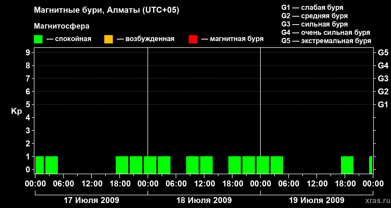 Изменения геомагнитного индекса Kp с 17 по 19 июля 2009 года для средних широт