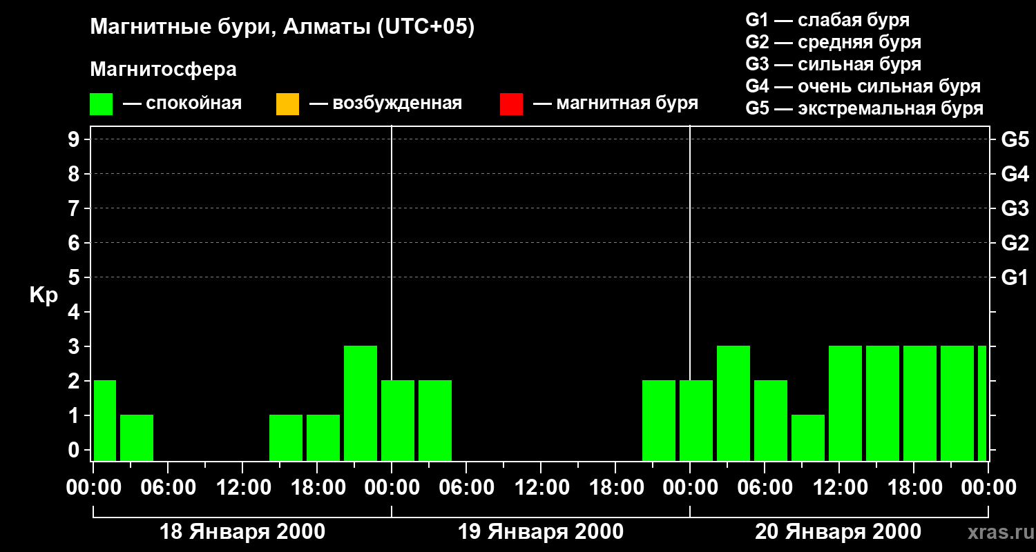 Изменения геомагнитного индекса Kp с 18 по 20 января 2000 года для средних широт