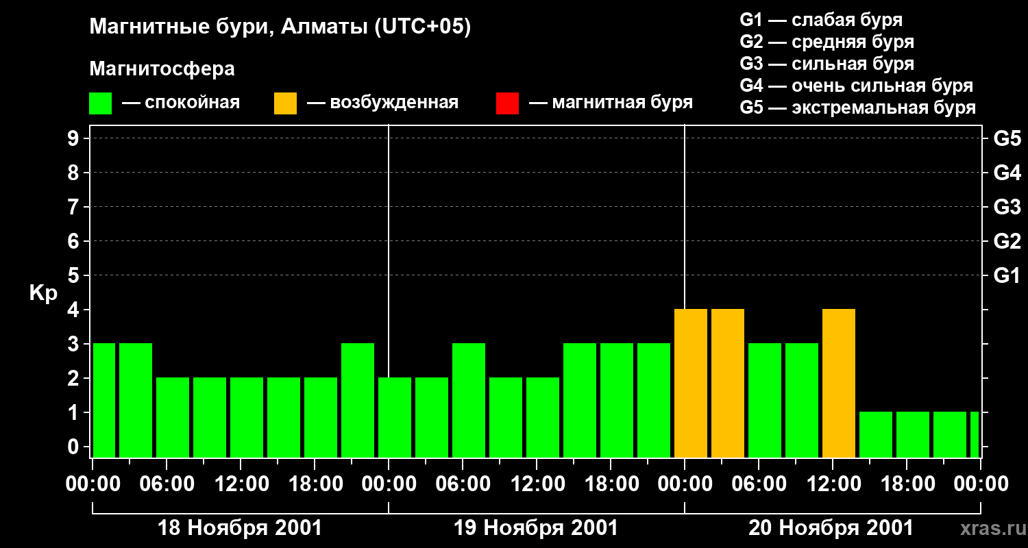Изменения геомагнитного индекса Kp с 18 по 20 ноября 2001 года для средних широт