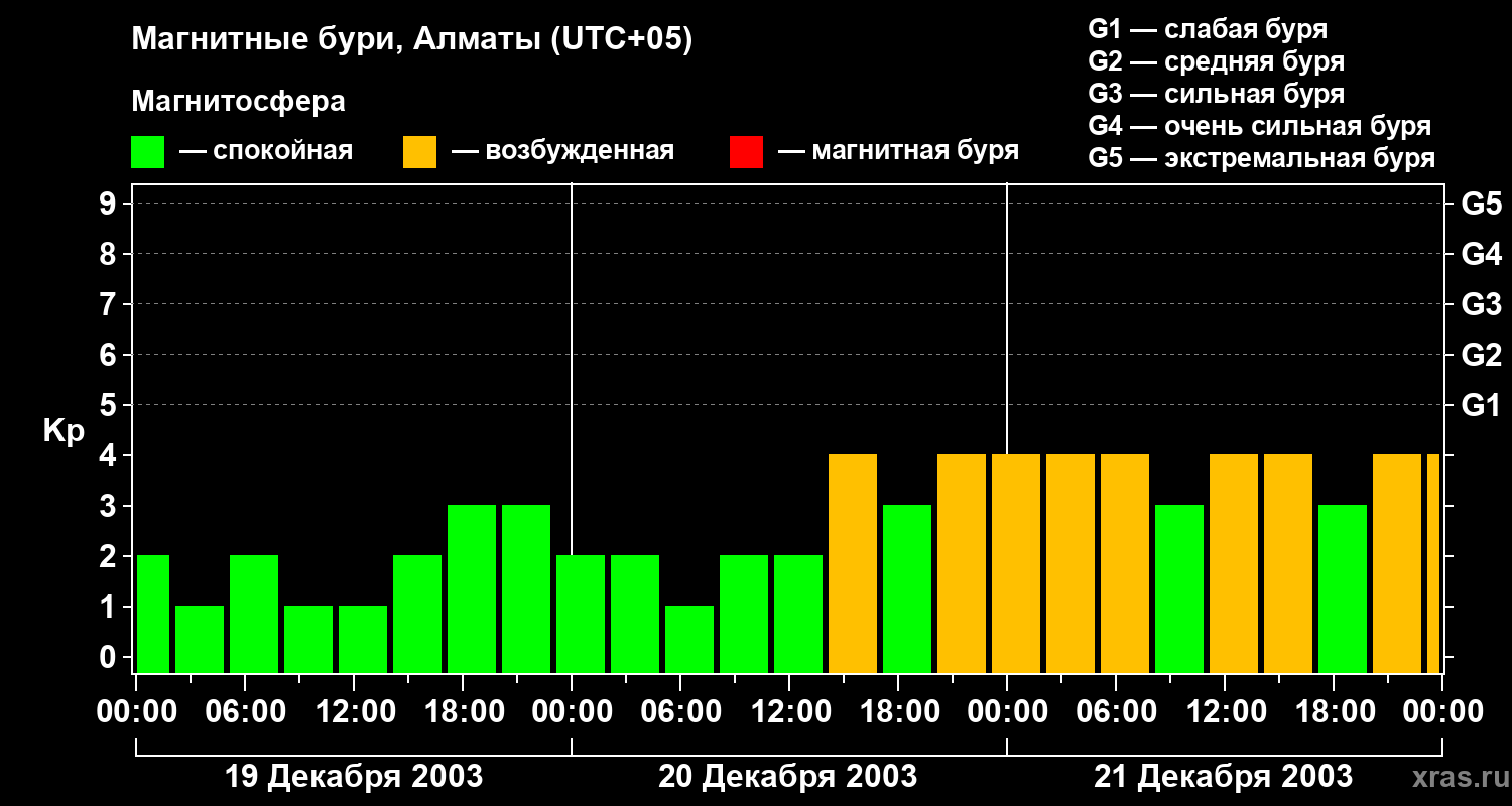 Изменения геомагнитного индекса Kp с 19 по 21 декабря 2003 года для средних широт