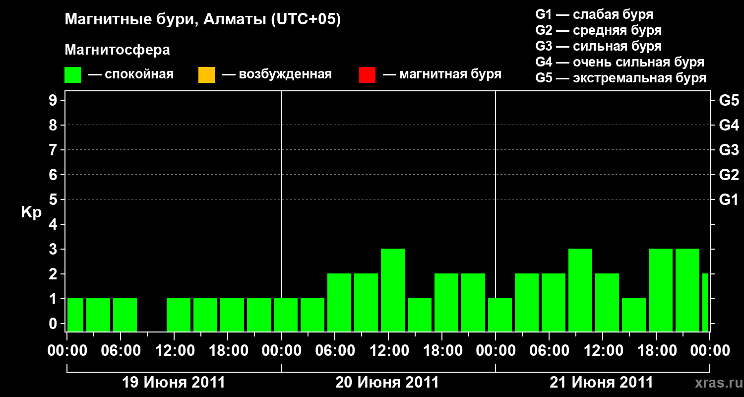 Изменения геомагнитного индекса Kp с 19 по 21 июня 2011 года для средних широт