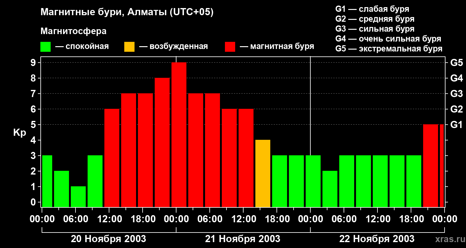 Изменения геомагнитного индекса Kp с 20 по 22 ноября 2003 года для средних широт