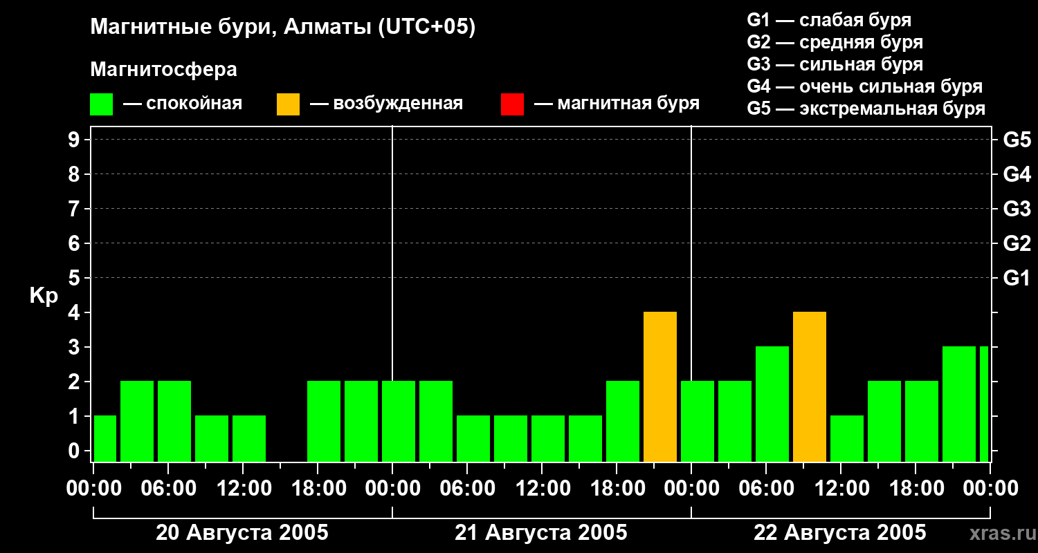 Изменения геомагнитного индекса Kp с 20 по 22 августа 2005 года для средних широт
