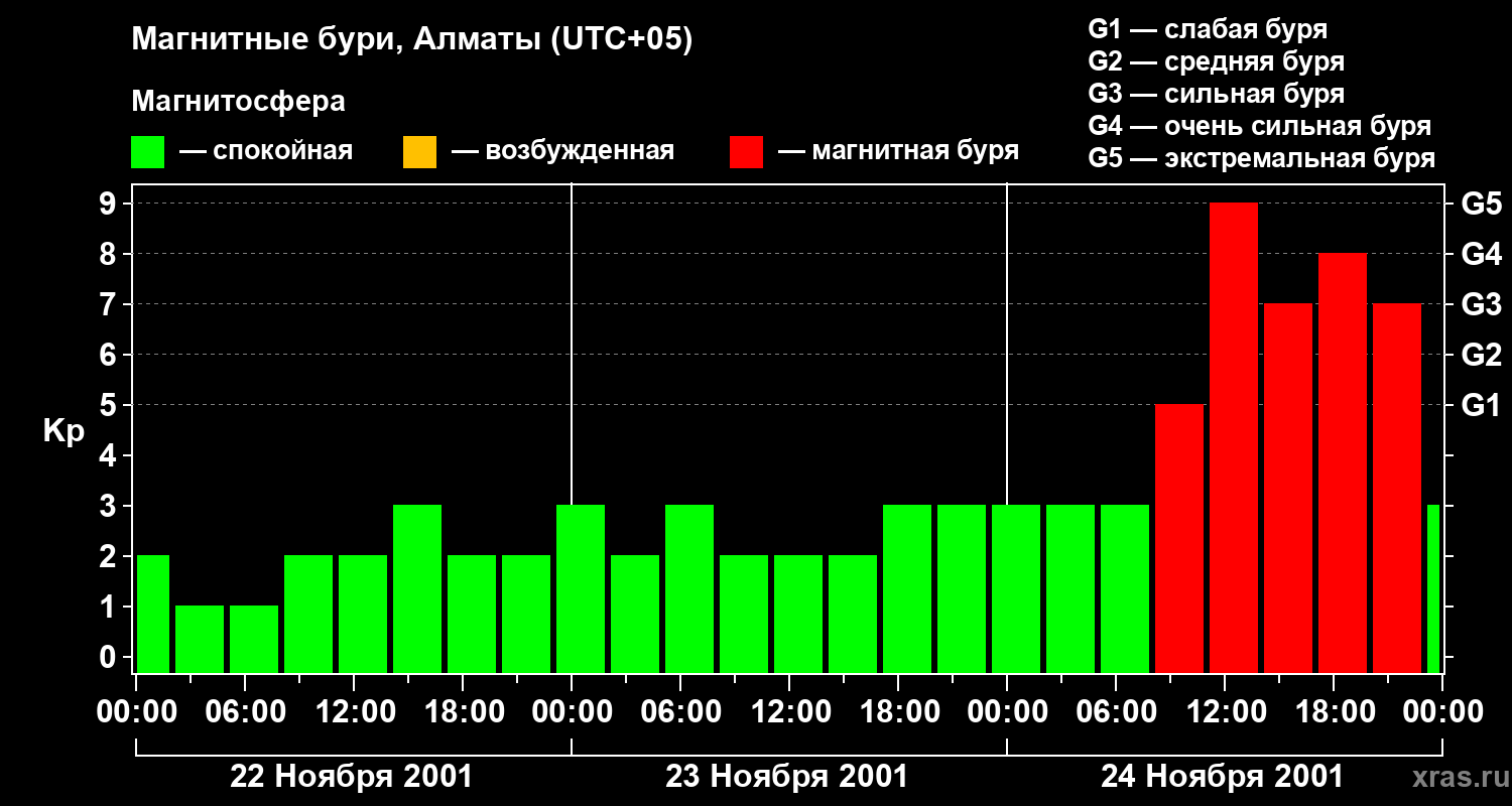 Изменения геомагнитного индекса Kp с 22 по 24 ноября 2001 года для средних широт