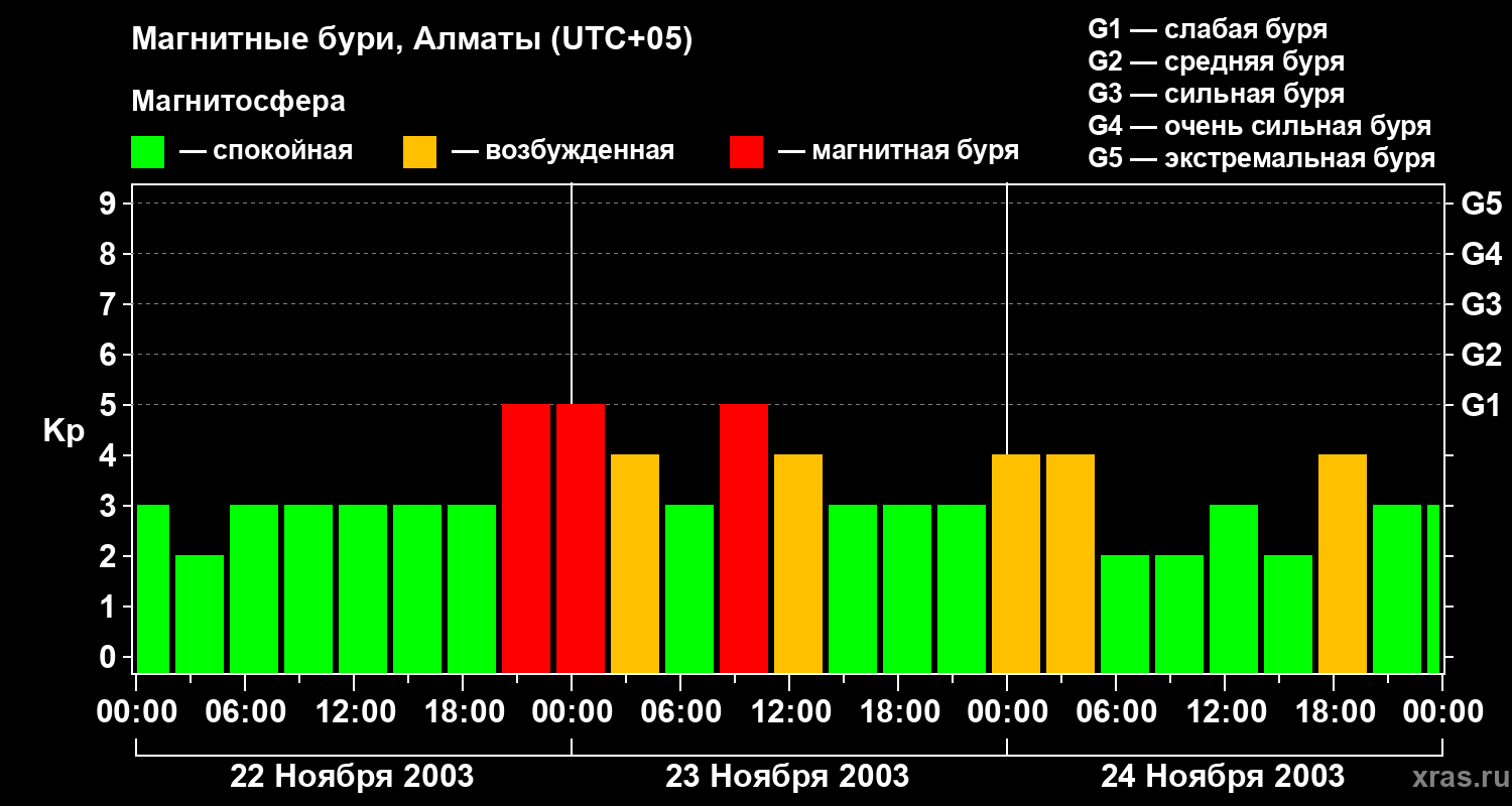 Изменения геомагнитного индекса Kp с 22 по 24 ноября 2003 года для средних широт