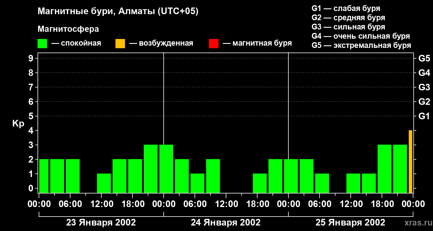 Изменения геомагнитного индекса Kp с 23 по 25 января 2002 года для средних широт