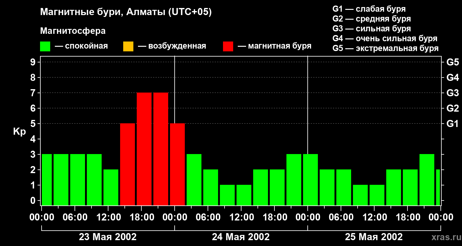 Изменения геомагнитного индекса Kp с 23 по 25 мая 2002 года для средних широт